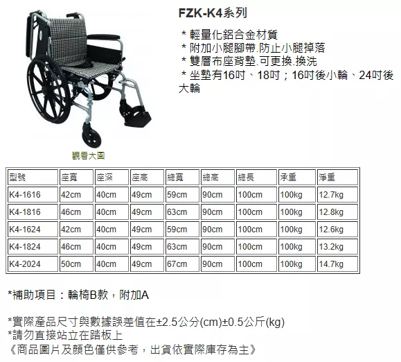 鋁合金輪椅 富致康 FZK-K4 折背 拆手拆腳 脊損輪椅 輪椅B款+附加功能A款